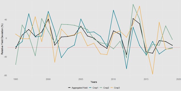 Zur Veranschaulichung des Konzepts dient Abbildung 1. Sie enthält zufällig gewählte relative Ertragsabweichungen von den erwarteten Mittelwerten dreier verschiedener Kulturen auf einem Betrieb, die durch farbige Linien dargestellt sind. Die aggregierte relative Ertragsabweichung dieser drei Kulturen wird durch die schwarze Linie dargestellt. Bei der Aggregation werden die durchschnittlichen betriebsspezifischen Flächenanteile jeder Kultur sowie der Preis jeder Kultur berücksichtigt. Diese beiden Faktoren werden über den untersuchten Zeitraum konstant gehalten.