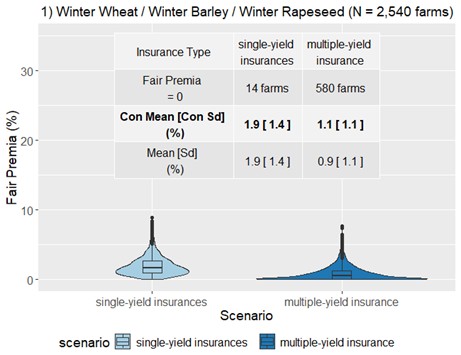 Ein weiterer wichtiger Vorteil der Mehrkulturen-Ertragsversicherung für landwirtschaftliche Versicherer betrifft das Risiko der adversen Selektion. Wir zeigen, dass die Standardabweichungen der fairen Prämien von Mehrkulturen-Ertragsversicherung deutlich geringer ausfallen als die von Einzelertragsversicherungen. Wenn eine Versicherungsgesellschaft also Betriebe mit unbekannten Erträgen versichern möchte, kann sie ihr Risiko der adversen Selektion mithilfe von Mehrkulturen-Ertragsversicherung verringern.