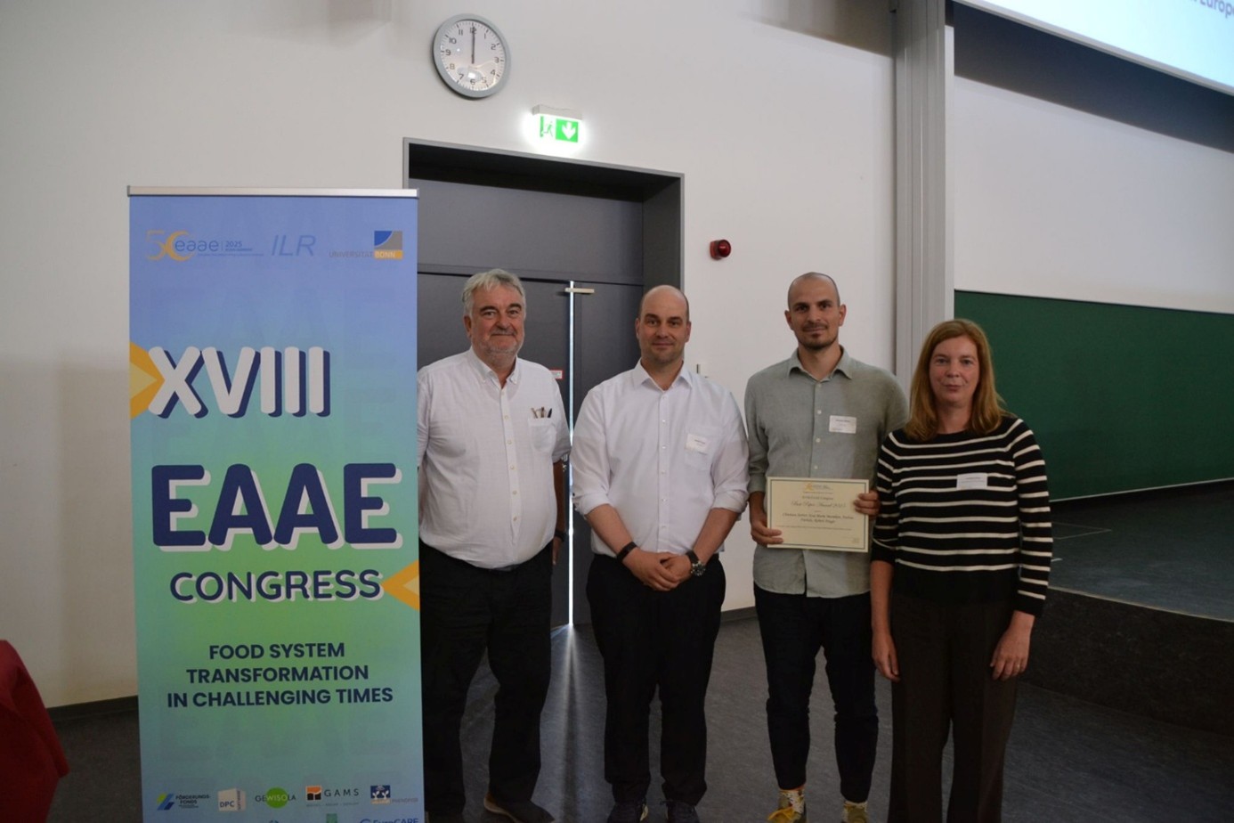 Das Paper ‚Large Language Model Analysis Reveals Key Reasons Behind Massive Farmer Protests in Europe‘ geleitet von Christian Stetter und verfasst gemeinsam mit den Koautor:innen Eva-Marie Meemken, Andrea Fürholz und Robert Finger, wurde mit dem Best Conference Paper Award des 18. Kongresses der European Association of Agricultural Economists (EAAE) ausgezeichnet. Der Kongress fand vom 26.-29. August 2025 in Bonn statt. Das Paper wurde aus mehr als 1.300 eingereichten Beiträgen ausgewählt.