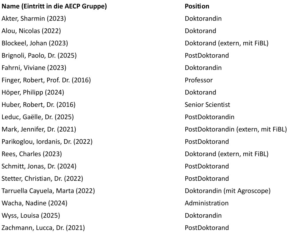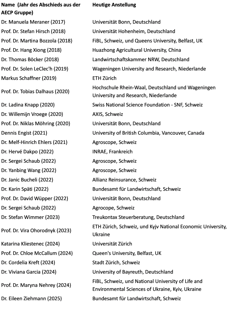 Seit unserem Start haben 28 Personen unsere Gruppe verlassen, grösstenteils nach Abschluss eines Doktorats oder Postdoktorats. Tabelle 2 gibt einen Überblick über Alumni und ihre aktuellen Tätigkeiten. Bisher wurden acht AECP-Alumni zu ProfessorInnen und Professoren an führenden Universitäten (z.B. Wageningen, Bonn, TU München, Hohenheim, Belfast, Wuhan) berufen. Zudem sind viele Ehemalige in Forschungsinstituten (z. B. Agroscope, FiBL, INRAE), der Verwaltung (z.B. BLW) und in der Industrie tätig.