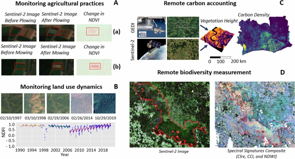 Abbildung 1. Mit fortschreitendem technologischem Fortschritt werden immer mehr Agrarumweltpolitik-relevante Indikatoren messbar. Viele landwirtschaftliche Praktiken, wie z.B. Pflügen und Mähen können bereits verlässlich auf Satellitendaten von Algorithmen erkannt werden (A), und das trifft auch für allgemeinere Landnutzungsdynamiken z.B. in tropischen Wäldern zu (B). Wichtig für globale Kohlenstoff-Märkte: Auch der gespeicherte Kohlenstoff in bestehender Vegetation kann bereits gut quantifiziert werden, durch das Mischen von Informationen wie Höhe und Typ der Vegetation, kombiniert mit einzelnen In-Situ Messungen (C). Weiterhin eine technische Herausforderung stellt die Messung von Biodiversität dar. Eine grobe Quantifizierung der Habitat- und Flora-Diversität in Wäldern funktioniert schon gut (D), aber vergleichbare Messungen für Fauna und z.B. Getreideanbauflächen bleiben noch eine Herausforderung.