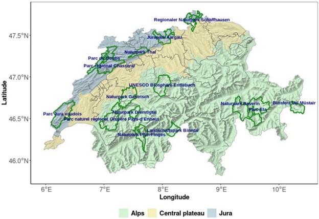 Figure 1.Parcs naturels régionaux des principales régions biogéographiques de Suisse: Alpes (en bas à droite), Plateau et Jura (en haut à gauche). Les contours en vert foncé indiquent les limites des parcs au moment de leur désignation.