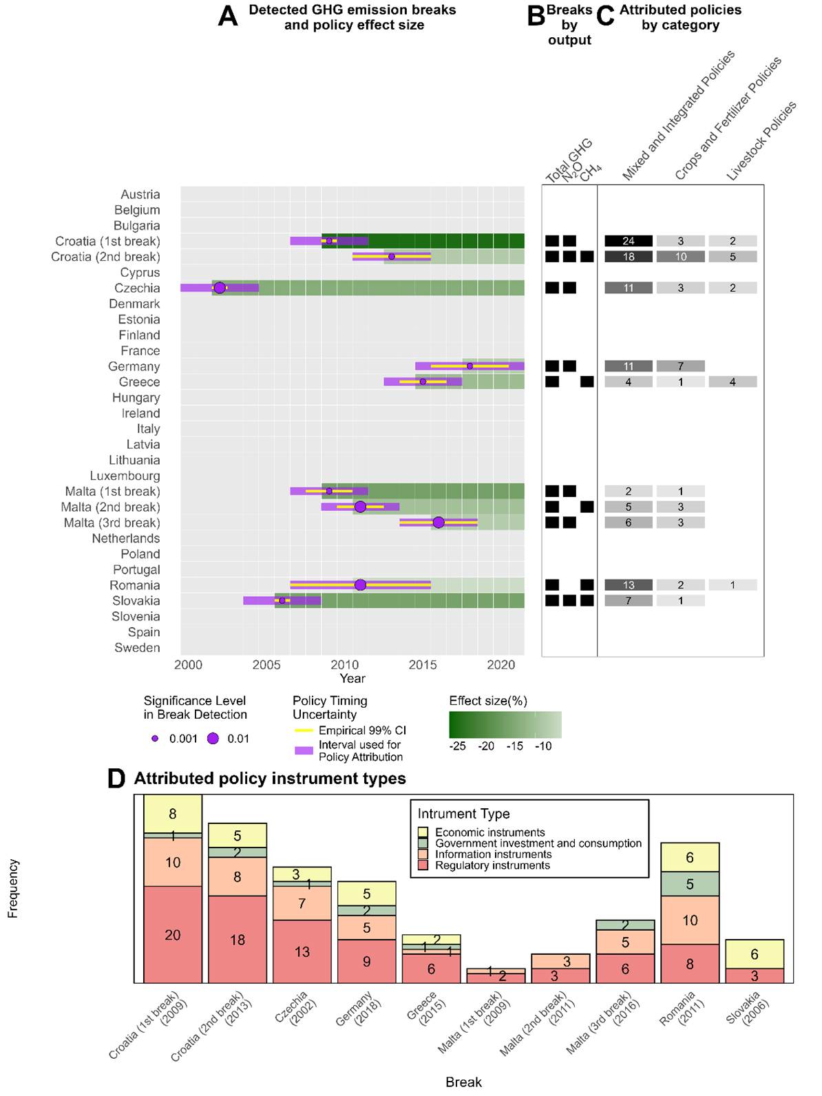 Abbildung 2: Ergebnisse der Bruchstellenanalyse und Politikzuordnung. A: Identifizierte Emissionsrückgänge in sieben EU-Ländern – je dunkler das Grün, desto stärker die Reduktion (bis zu 24%). Die violetten Punkte markieren das Signifikanzniveau der Bruchstelle. B: Betroffene Treibhausgase – Lachgas (N₂O) war häufiger betroffen als Methan (CH₄). C: Anzahl der zugeordneten Politiken nach Kategorie: Integrierte Politiken dominieren, gefolgt von Dünge- und Tierhaltungsmassnahmen. D: Zusammensetzung der Politikinstrumente – regulatorische Instrumente (rot) bilden das Fundament erfolgreicher Politikmixe, ergänzt durch ökonomische Anreize und Informationsmassnahmen.