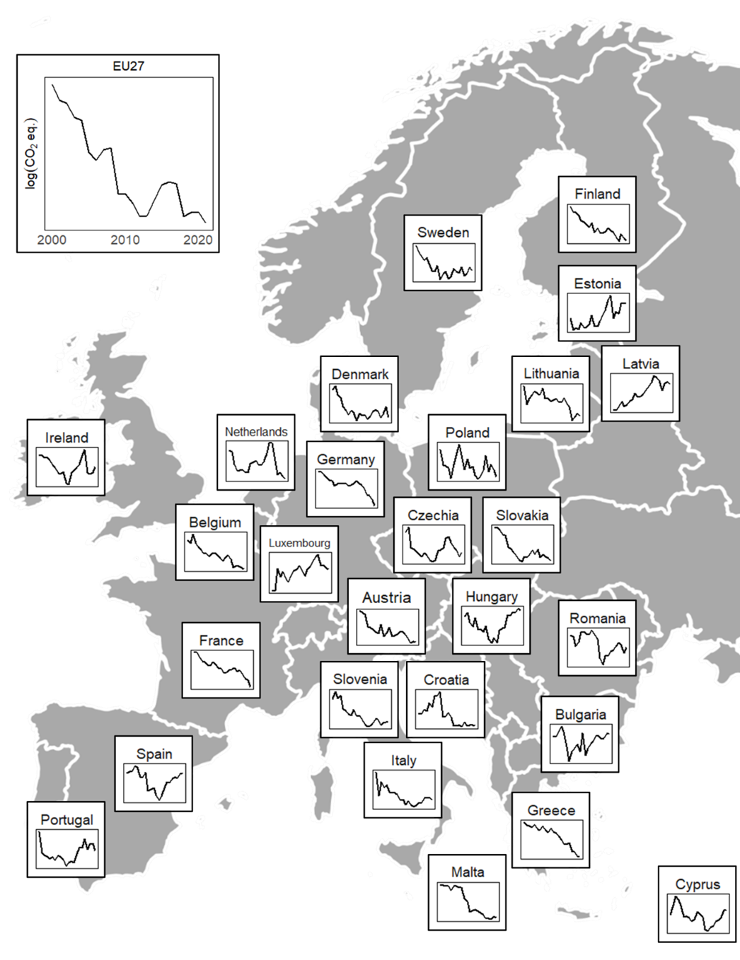 Basierend auf neuen methodischen Entwicklungen, dreht unsere Studie die übliche Forschungslogik um. Statt von einer bestimmten Politik auszugehen und deren Wirkung zu messen, suchen wir zuerst mittels Regressionsanalyse und Bruchstellenerkennung («Break Detection») (Koch et al., 2022; Stechemesser et al., 2024) nach starken, abrupten Rückgängen in den Emissionsdaten der jeweiligen 27 EU-Mitgliedstaaten zwischen 2000 und 2021 (Abbildung 1). Wird ein solcher Bruch identifiziert, wird systematisch untersucht, welche Politikmassnahmen diese Rückgänge ausgelöst haben könnten. Um die relevanten Politiken im Detail zu charakterisieren, wurde ein öffentlich verfügbares KI-Sprachmodell (LLM) eingesetzt (Yang et al., 2025), das einzelne Politikmassnahmen nach ihren Instrumenten klassifiziert hat, etwa ob es sich um Vorschriften, Subventionen oder Informationsmassnahmen handelt.