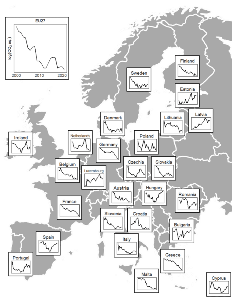 Abbildung 1: Entwicklung der landwirtschaftlichen Treibhausgasemissionen in den EU-Mitgliedstaaten (2000–2021). Die Miniaturdiagramme zeigen die Emissionsverläufe (logarithmiert) für jedes Land. Während die meisten Länder rückläufige Trends aufweisen, verzeichnen einige Staaten wie Lettland, Ungarn oder Zypern steigende Emissionen. Die Unterschiede verdeutlichen die Vielfalt der landwirtschaftlichen Strukturen und Politiklandschaften innerhalb der EU. Datenquelle: FAOSTAT (2024).